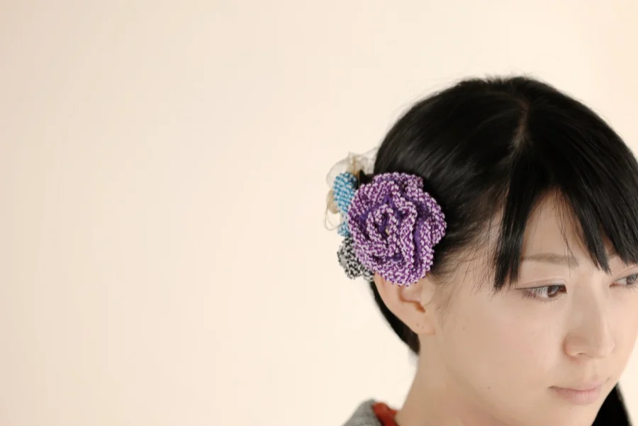 Kanoko shibori is an important women’s fashion statement for elegance and beauty. In Kyoto, it has traditionally been used as the material for hair accessories to adorn nihongami, Japanese traditional hairstyle typically worn by Maiko, young apprentice Geiko. While for traditional performing arts including Kabuki theatre, it stands as an iconic symbol to evoke a charm of Japanese ladies.
